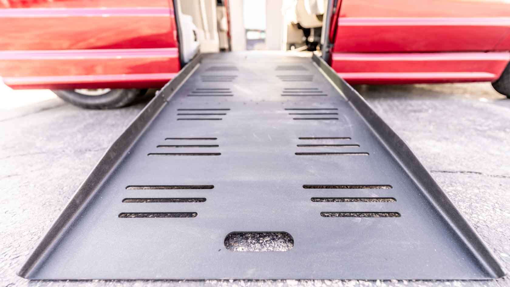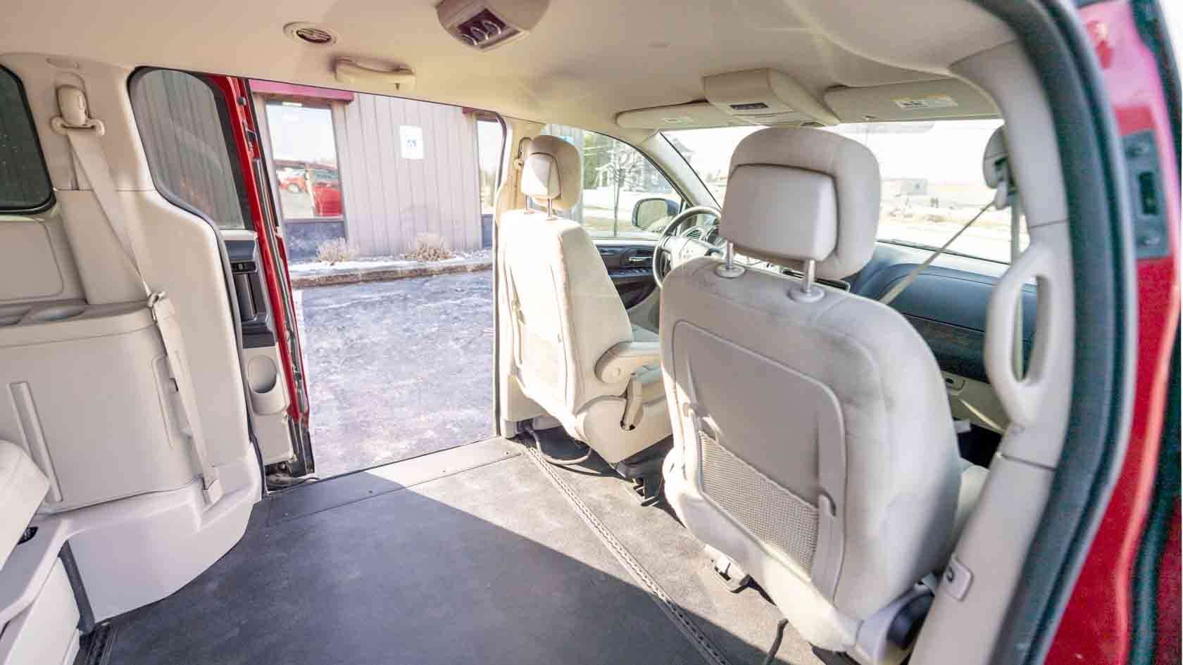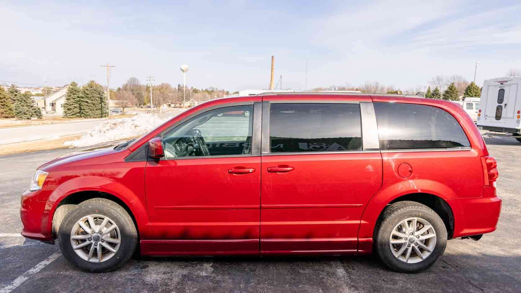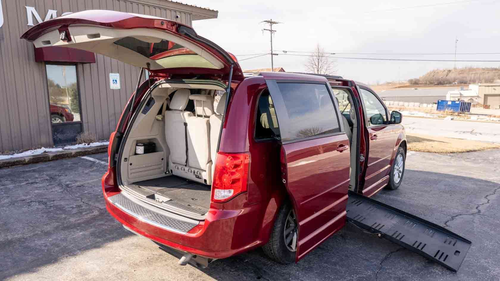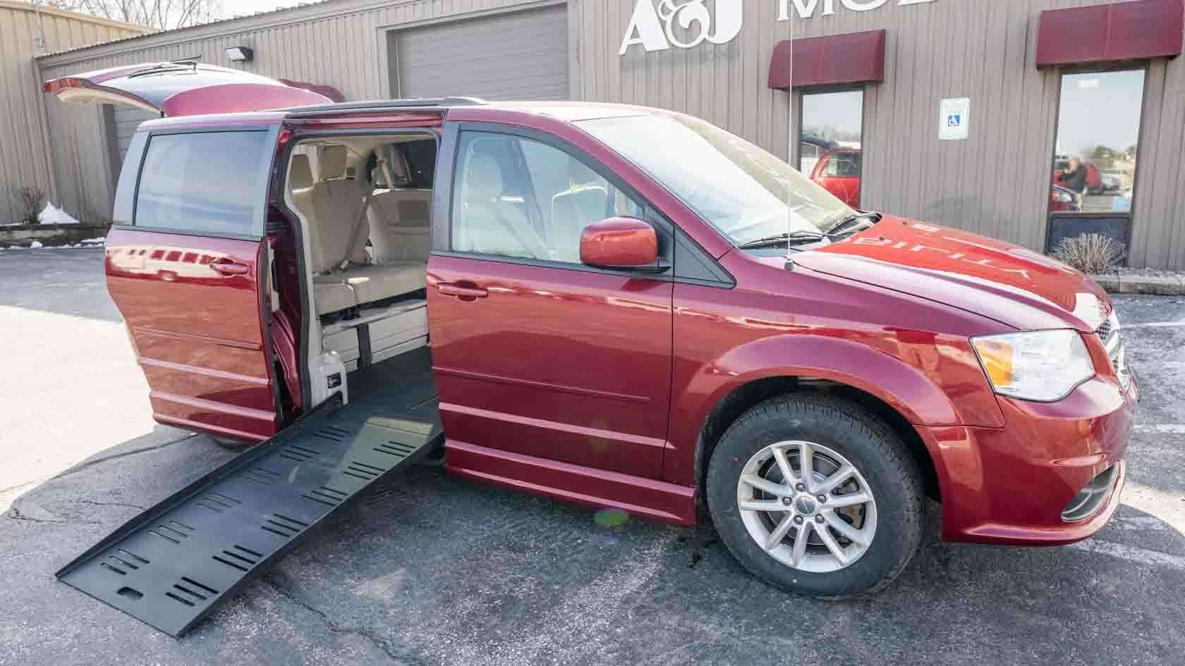 Used red 2014 Dodge Grand Caravan SXT Entervan wheelchair van has a power-folding side-entry wheelchair ramp for sale in Wisconsin near you. A&J Mobility has five locations in Wisconsin serving the Midwest. Some people still call it a disability van or a handicap van, but whatever you call it, you can always say, "A&J Mobility has a trusted wheelchair van for sale near me."