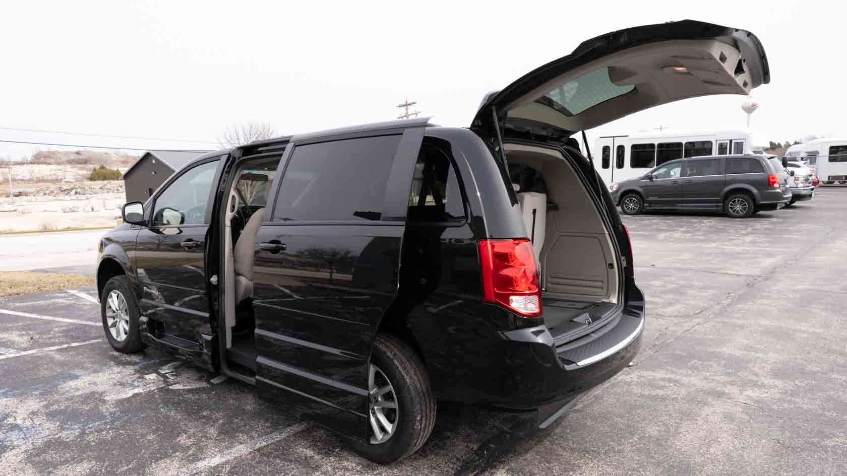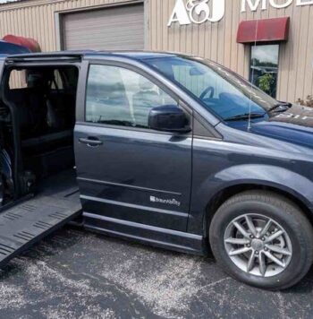 Used black 2015 Dodge Grand Caravan SXT Entervan Infloor wheelchair van has an infloor side-entry wheelchair ramp for sale in Wisconsin near you. A&J Mobility has five locations in Wisconsin serving the Midwest. Some people still call it a disability van or a handicap van, but whatever you call it, you can always say, "A&J Mobility has a trusted wheelchair van for sale near me."